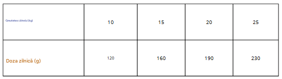 Proteină brută 26%, grăsime 15%, umiditate 10%, cenușă brută 7%, fibre brute 2,2%, calciu 1,5%, fosfor 1,1%, Omega-3 0,2%, Omega-6 1,7%.