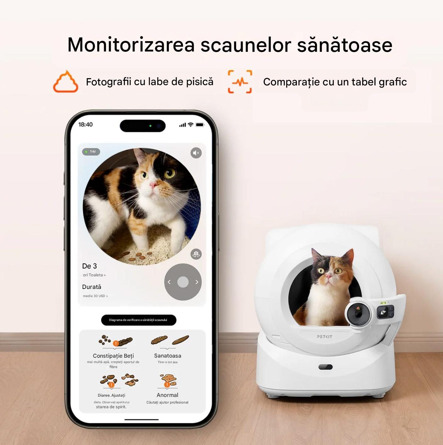 Aplicația inteligentă PETKIT vă notifică ori de câte ori pisica folosește toaleta, când nisipul este insuficient sau când recipientul de deșeuri este plin. Creați profiluri pentru pisicile dvs. și urmăriți informații despre starea lor de sănătate, consistența și culoarea scaunului, greutatea, frecvența eliminărilor... Aplicația oferă analize, grafice și cronologii ale stării de sănătate. Cu aplicația din smartphone-ul dvs., aveți control total asupra a ceea ce se întâmplă în toaletă. Aplicația este disponibilă în App Store pentru iOS și Google Play pentru Android.